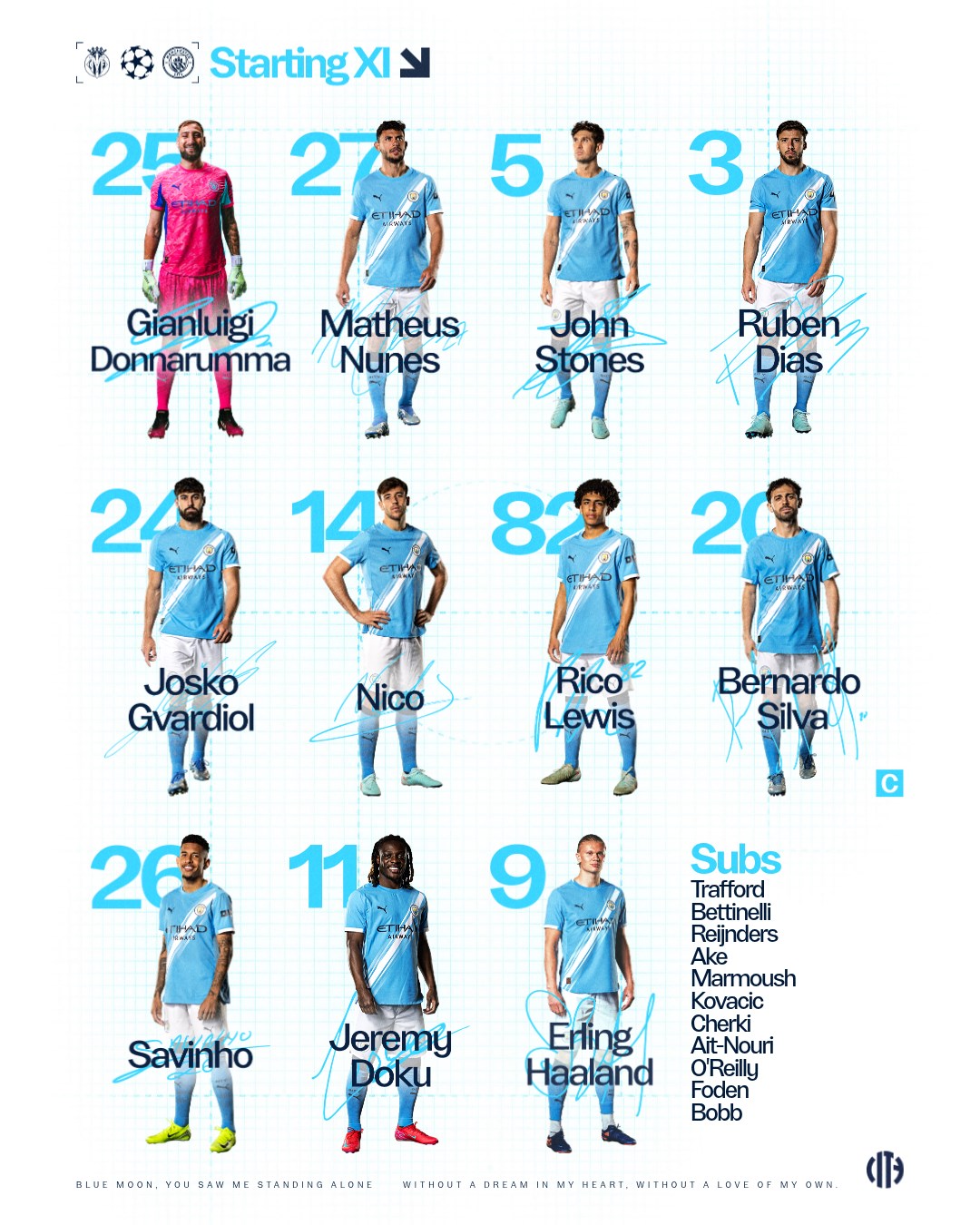 Manchester City: Gianluigi Donnarumma, Rico Lewis (Reijnders 73′), John Stones, Ruben Dias, Josko Gvardiol, Nico Gonzalez (Kovacic 57′), Bernardo Silva, Matheus Nunes, Savinho (Marmoush 86′), Jeremy Doku (Oscar Bobb 73′), Erling Haaland (Cherki 86′).
