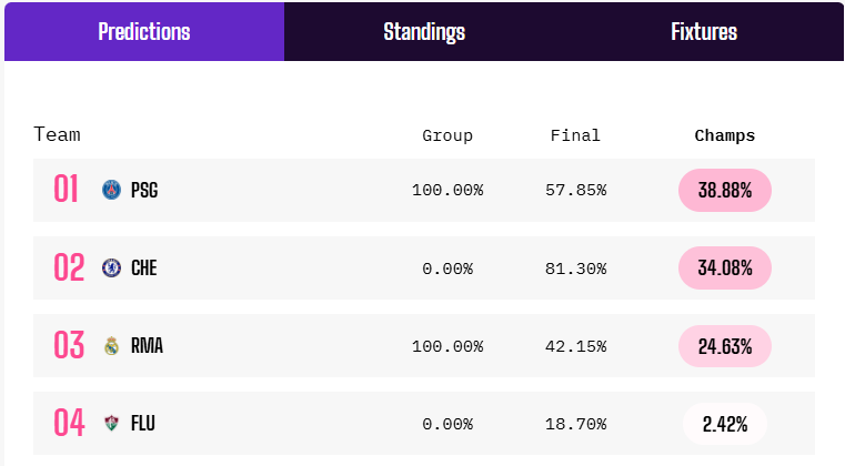 PSG có 57,85% cơ hội đá chung kết và 38,88% cơ hội giành chức vô địch, còn của Real là 42,15% và 24,63%. Như vậy theo Siêu máy tính của Opta, PSG được kỳ vọng sẽ thắng Real, trong khi Chelsea được dự đoán sẽ đánh bại Fluminense để góp mặt ở trận đấu cuối cùng của giải.