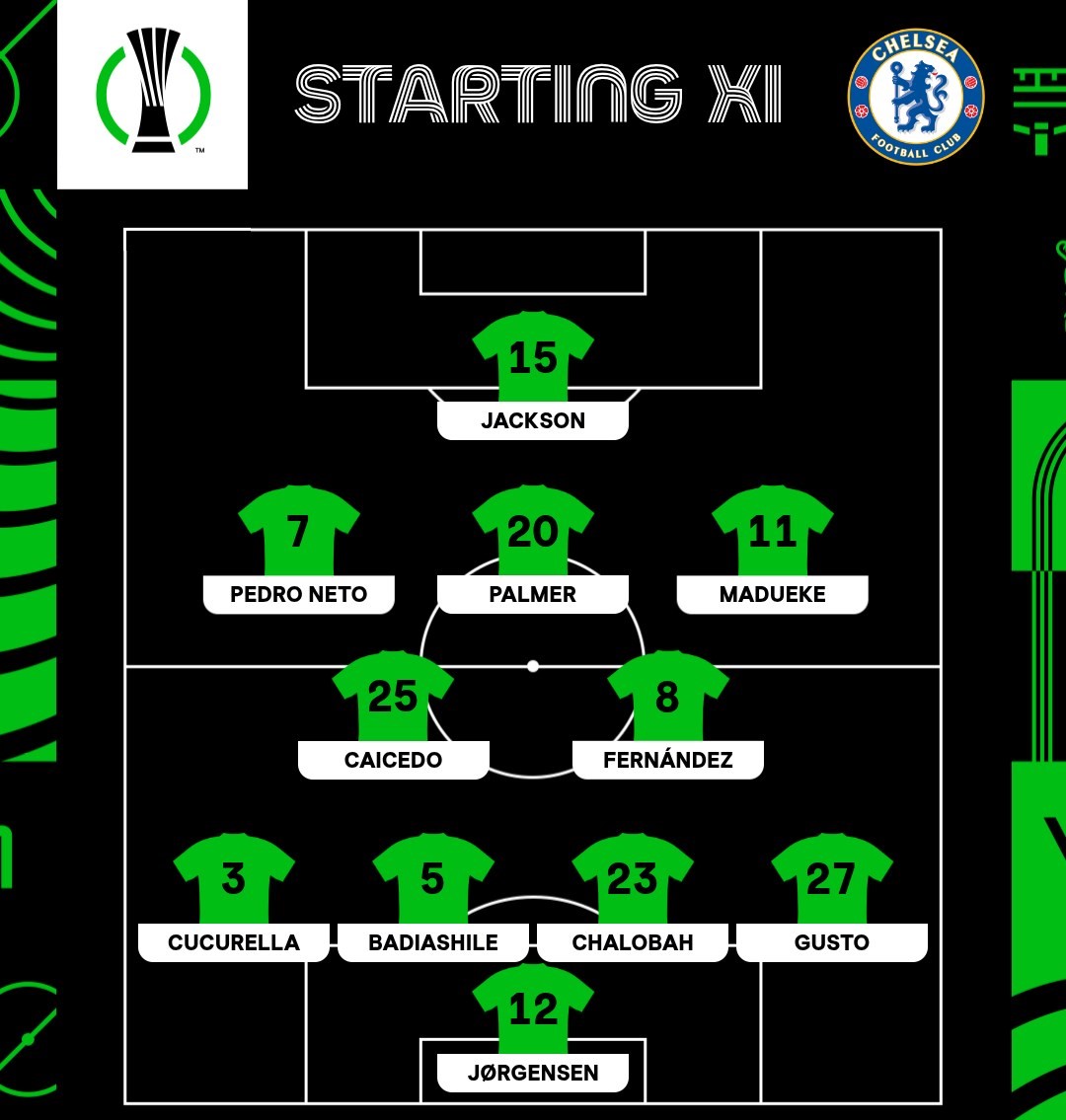 Chelsea: Filip Jorgensen, Malo Gusto (Reece James 46′), Trevoh Chalobah, Benoit Badiashile (Colwill 61′), Marc Cucurella, Moises Caicedo, Pedro Neto (Sancho 61′), Enzo Fernández, Cole Palmer, Noni Madueke, Nicolas Jackson (Dewsbury-Hall 80′).